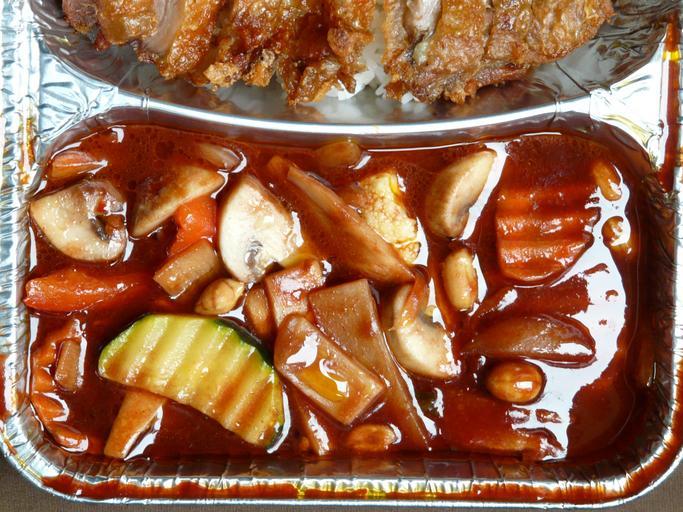 Keywords: fast food junk food snack eat vegetables sauce roasted duck rice meat asia
