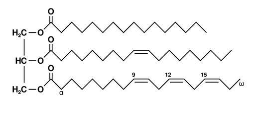 | Keywords: Fat triglyceride shorthand formula.PNG Shorthand line formula for a typical example molecule of <br> Fat Triglycerides<br> in native fat or oil <br> left part glycerol <br> right part from top to bottom palmitic acid oleic acid alpha-linolenic acid <br> chemical formula C<sub>55</sub>H<sub>98</sub>O<sub>6</sub> <br> ---- Strichformel für ein typisches Beispielmolekuel eines<br> Fett-Triglycerides<br> in pflanzlichen Fetten und Oelen <br> linker Teil Glycerin<br> rechts von oben nach unten Palmitinsaeure Oelsaeure alpha-Linolensaeure <br> Summenformel C<sub>55</sub>H<sub>98</sub>O<sub>6</sub> <br> ---- shorthand formula of a fat triglyceride molecule author 2005-04-21 Wolfgang Schaefer released to public domain on 21 April 2005 by Wolfgang Schaefer Seoul Korea Triglycerides Palmitate esters |
