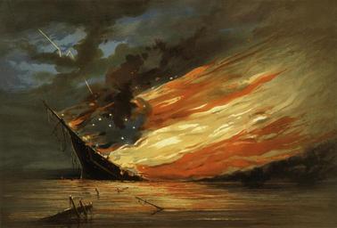 | Keywords: Fate of the Rebel Flag.jpg Title Fate of the rebel flag / painted by Wm Bauly ; lith of Sarony Major Knapp 449 Broadway N Y Creator s Sarony Major Knapp Lith lithographer Related Names Bauly William artist Schaus William publisher Date Created/Published New York Published by William Schaus 749 Broadway New York c1861 Medium 1 print on wove paper lithograph printed in colors ; image 25 1 x 32 1 cm Summary The second of a pair of patriotic prints after paintings by William Bauly issued by New York art publisher William Schaus in September 1861 both were deposited for copyright on the sixth of that month Fate of the Rebel Flag resembles its companion piece Our Heaven Born Banner no 1861-20 in format coloring and its militantly Unionist theme In a spectacular nocturnal scene a large warship sinks and burns on a calm sea littered with debris The flames take on the configuration of the red white and blue flag of the Confederacy the blue field with seven stars being formed by the night sky showing through the flames Lightning strikes the flag from the upper left Reproduction Number LC-USZC4-12419 color film copy transparency LC-USZ62-91511 b w film copy neg Rights Advisory No known restrictions on publication Call Number PGA - Sarony Major Knapp--Fate of the rebel B size P P Repository Library of Congress Prints and Photographs Division Washington D C 20540 USA Notes Title from item Entered 1861 by W Schaus The Library's copy is the copyright deposit impression and bears the November 15 stamp of the State Department Published in American political prints 1766-1876 / Bernard F Reilly Boston G K Hall 1991 entry 1861-21 circa 1861 chromolithograph Library of Congress Bookmark http //www loc gov/pictures/item/2003689293/ object history exhibition history credit line Uploaded cropped image from large tif file accession number LOC-image pnp cph 3g12419 PD-old-70-1923 Paintings of the American Civil War Flags of the Confederate States of America in art |