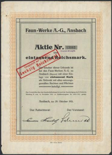 Keywords: Faun-Werke AG 1000 RM 1921.jpg de Aktie über 1000 Mark der Faun-Werke AG vom 29 Oktober 1921 1921-10-29 www hwph de/images/pa3/Los0585 jpg Unbekannte Autoren und Grafiker; Scan von HWPH Historisches Wertpapierhaus AG other versions PD-old-70-1923 Faun vehicles Stock certificates from Germany Faun-Werke AG 1921 Stock certificates from Germany |