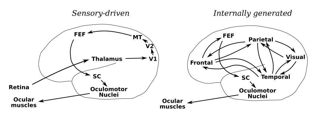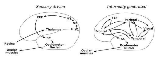 | Keywords: Feedforward-vs-feedback-driven-eye-movements.svg en Diagram comparing neural signal flow in the brain for eye movements driven by detection of a visual change in sensory input versus eye movements driven by internal brain dynamics i e thought The areas shown and their locations are simplified approximations of the reality own Looie496 2008-09-28 Anatomical plates and drawings of the human brain Vision Neural networks Feedforward Feedback | ||||