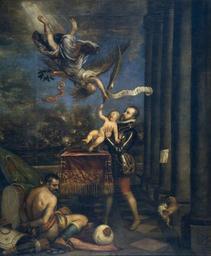 | Keywords: Felipe IV offers Ferdinand to Glory.jpg Battle of Lepanto in 1571 and the birth shortly afterwards of a male heir to King Philip II of Spain Don Fernando which were both seen as signs of God's favour The battle is shown in the background and a bound and defeated Turk at Philip's feet An angel descends from heaven bearing a palm branch with a motto for Fernando who is held up by Philip Majora tibi may you achieve greater deeds Titian died in 1576 and Prince Fernando in 1578 Lepanto effectively ended Ottoman ambitions in the western Mediterranean Reference Robert Enggass and Jonathan Brown Italian and Spanish Art 1600 “1750 Sources and Documents Evanston IL Northwestern University Press 1992 ISBN 0810110652 p 213 es Tiziano Felipe II tras la victoria de Lepanto ofrece al prÃncipe Fernando al cielo 1572-1575 óleo sobre lienzo 335 x 274 cm museo del Prado Madrid España Creator Titian 1572 1575 Philip II offering Fernando jpg Museo del Prado PD-old-100 Religious paintings by Titian Paintings by Titian in the Prado Museum Philip II of Spain offering Fernando to Victory Angels with banners Upside down 16th-century oil on canvas paintings in Spain 16th-century paintings of angels with humans |