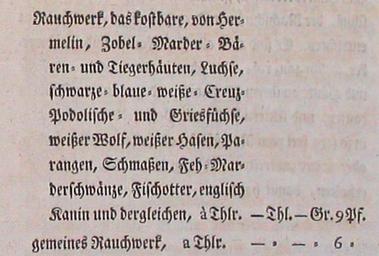 | Keywords: Fell-Tarife Friedrich August von Sachsen etc 1801 (2 crop).jpg Preisedikt für Felle von 1801 Seitenausschnitt <br> Seite 3 Ausschnitt Rauchwerck das kostbar von Hermelin Zobel- Marder Bären und Tiegerhäuten Luchse schwarze- blaue- weiße Creuz- Podolische- Podolien Gebiet in der südwestlichen Ukraine und im nordöstlichen Moldawien und Griesfüche weißer Wolf weißer Hasen Parangen žschwarze zarte Lammfelle Schmaßen Lammfell-Schmaschen Feh- Marderschwänze Fischotter englisch Kanin und dergleichen á - Thl - Gr 9 Pf <br> gemeines Rauchwerck á Thl - - 6 Collection G C Franke 1801-03-31 Friedrich August von Sachsen PD-old-100 Fell-Tarife Friedrich August von Sachsen etc 1801 2 Ausschnitt jpg <gallery> Fell-Tarife_Friedrich_August_von_Sachsen_etc_1801 1 jpg Fell-Tarife Friedrich August von Sachsen etc 1801 2 jpg Fell-Tarife_Friedrich_August_von_Sachsen_etc_1801 3 jpg Fell-Tarife_Friedrich_August_von_Sachsen_etc_1801 4 jpg </gallery> Furriers in Germany Fur wholesale dealers in Germany Domestic dog fur-skins Sheepskins Calf fur-skins Red fox fur-skins Deer skins Pony fur-skins Donkey fur-skins Hare fur-skins Goat fur-skins Sable fur-skins Marten fur-skins Bear fur-skins Cross-fox fur-skins Gray fox fur-skins Wolf fur-skins Squirrel fur-skins Rabbit fur-skins Otter fur-skins Polar fox fur-skins Collection G C Franke 1801 in Germany 1801-03-31 Fur trading values Skins 1801-03-31 Fur fashion in 1801 |