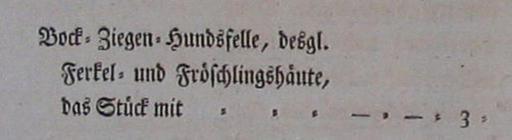| Keywords: Fell-Tarife Friedrich August von Sachsen etc 1801 (2 Ausschnitt 2).jpg Preisedikt für Felle von 1801 <br> Seite 2<br> Rindshäute das Stück mit - Thl 1 Gr 3 Pf ausländische deren dergestalti- ge Qualität durch Grenzbeschei- nigungen oder sonst hinlänglich beigebracht worden bleiben bei dem bisherigen Satz vom Stück - - 9 Bock- Ziegen- Hundsfelle desgl Ferkel- und Fröschlingshäute das Stück mit - - 3 Fell-Tarife_Friedrich_August_von_Sachsen_etc_1801_ 2 jpg thumb 2011-01-28 12 19 UTC Fell-Tarife_Friedrich_August_von_Sachsen_etc_1801_ 2 jpg Friedrich August von Sachsen derivative work Kürschner <span class signature-talk >talk</span> cropped Kürschner Fell-Tarife_Friedrich_August_von_Sachsen_etc_1801_ 2 jpg PD-old Original upload log This image is a derivative work of the following images File Fell-Tarife_Friedrich_August_von_Sachsen_etc_1801_ 2 jpg licensed with Cc-pd-mark-footer PD-old 2010-10-23T16 30 47Z Rifra 2048x1536 1548269 Bytes <nowiki> Preisedikt für Felle von 1801 Seite 2 Rindshäute das Stück mit - Thl 1 Gr 3 Pf ausländische deren dergestaltige Qualität durch Grenzbescheinigungen oder sonst hinlänglich beig</nowiki> Uploaded with derivativeFX 1801 in Germany Collection G C Franke Domestic dog fur-skins Deer skins Goat fur-skins Wild boar skins Furs literature German Fur trading values Skins |