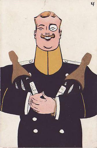 | Keywords: Felle Uniformierter mit Sektflaschen.jpg Ansichtskarte Uniformierter mit zwei Sektflaschen http //www histocard info/catalog/voelligatypischeeugenfelleak-p-2928 html als Völlig atypische Eugen Felle AK signatur aber eindeutig by 1934 Creator Eugen Felle PD-old Eugen Felle Champagne bottles |