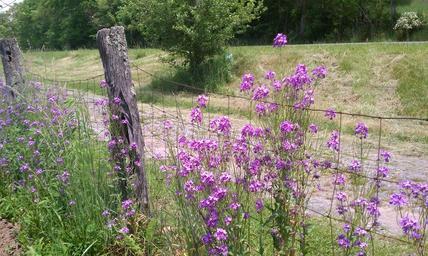 Keywords: fence flowers country road rural road rail fence nature country lane farmland