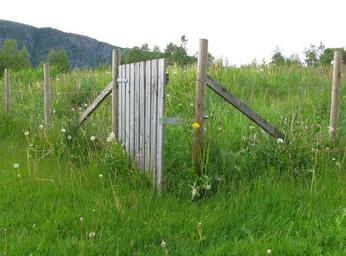 Keywords: fence wood post wire demarcation meadow grass green nature landscape norway scandinavia silent