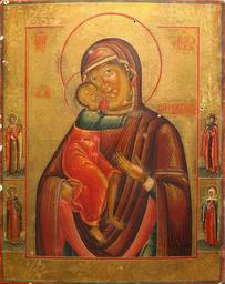 | Keywords: Feodorovskaya with saints with leaf-gold.jpeg Феодо овская икона Божией ате и с п иписными свв Ва ва ой Фотиньей Садоком и Паисием XIX век Де ево левкас сусальное золото темпе а Частное соб ание http //www cirota ru/forum/view php subj 53563 order pg 51 century 19 Author PD-Art Feodorovskaya |