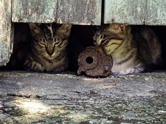 Keywords: feral cats relaxing looking cute animals felines fur outdoors mammal portrait watching building hiding structure wooden weathered ground shade