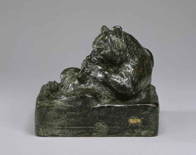 | Keywords: Ferdinand Barbedienne - Bear in a Trough - Walters 27111 - Profile.jpg Walters Art Museum artwork Creator Antoine-Louis Barye A bear lies in its water trough holding food between its paws When Barye exhibited a plaster of this sculpture at the Paris Salon in 1833 he titled it Alpine Bear A cast in bronze by Honoré Gonon was subsequently purchased along with the Dead Gazelle by the duke of Orléans No other casts were made during Barye's lifetime This particular cast bearing a gold plate stamped FB was issued between 1876 and 1889 by Ferdinand Barbedienne who had purchased a plaster model for it at the artist's estate sale in 1876 modeled 1832; cast 1876-1889 bronze with a black over green patina cm 11 4 13 3 9 8 accession number 27 111 14405 William T Walters Baltimore prior to 1889 mode of acquisition unknown Henry Walters city Baltimore Walters Art Museum Henry Walters Acquired by William T Walters before 1889 Signature BARYE; Signature Cast through from model F BARBEDIENNE FONDEUR; Number Engraved on underside of cast 115; Transcription Stamped on rectangular gold plate and set into bronze FB; Number Painted inside in white W 88 The Works of Antoine-Louis Barye American Art Gallery New York New York 1889-1890 Untamed The Art of Antoine-Louis Barye The Walters Art Museum Baltimore; Philbrook Museum of Art Tulsa; The Henry Morrison Flagler Museum Palm Beach 2007-2008 place of origin Paris France Walters Art Museum license Sculptures by Antoine-Louis Barye Ferdinand Barbedienne Media contributed by the Walters Art Museum needs category review Sculptures in the Walters Art Museum |