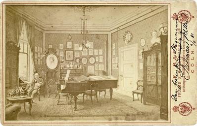 | Keywords: Ferdinand Hiller im Musikzimmer.jpg Ferdinand Hiller Komponist Gewandhauskapellmeister in Leipzig städt Musikdirektor und Konservatoriumsdirektor in Köln 1811-1885 Photographie seines Musikzimmers mit eigh Widmung 16 5 x 10 7 cm Köln 4 September 1881 http //www bassenge com/ 1881 Atelier F Raps Köln PD-old Music rooms 1881 photographs Ferdinand Hiller Images from Galerie Bassenge 1880s interiors in art | ||||