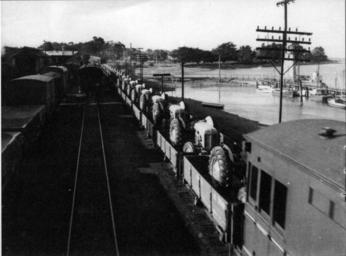 Keywords: train railway tasmania blackandwhite monochrome outdoor black and white Special train of Massey Ferguson TE20 tractors at Devonport, early 1950's. Special train of Massey Ferguson TE20 tractors at Devonport, early 1950's.