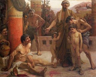 | Keywords: Fernand Sabatté - Un Spartiate montre à ses fils un ilote ivre (1900).jpg Fernand Sabatté 1874 - 1940 date 1900 oil canvas cm Institution École des Beaux-Arts Paris accession number object history credit line exhibition history Un Spartiate montre un esclave ivre a ses fils; painting won the 'Prix de Rome' prize in 1900 379740 PD-old-auto-1923 1940 DEFAULTSORT Sabbate Fernand; Spartan points 1900; École des Beaux-Arts Fernand Sabatte Paintings in École Nationale Supérieure des Beaux-Arts Prix de Rome for painting Alcoholism in art Males drinking in art Paintings of drunken people Slaves in art |