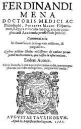 Keywords: Fernando de Mena 1587 De sanguinis missione & purgatione.jpg Fernando de Mena Commentaria in libros Galeni de sanguinis missione purgatione 2ª ed Turín 1587 1587 http //alfama sim ucm es/dioscorides/consulta_libro asp ref X533273160 idioma 0 Fernando de Mena PD-old PD-old-100 1587 books 16th-century books Fernando de Mena Medical books from Spain University of Alcalá History of Alcalá de Henares Spain in the 1580s Frontispieces from Spain Books in Latin Files by User Raimundo Pastor portadas