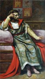 | Keywords: Fernando IV de Castilla (Ayuntamiento de León).jpg Retrato imaginario del rey Fernando IV de Castilla 1285-1312 Fue hijo del rey Sancho IV de Castilla y de la reina María de Molina Durante su minoría de edad su crianza y la custodia de su persona fueron encomendadas a su madre la reina María de Molina mientras que su tutoría fue confiada al infante Enrique de Castilla el Senador hijo de Fernando III de Castilla Durante su minoría de edad y también durante el resto de su reinado su madre procuró aplacar a la nobleza se enfrentó a los enemigos de su hijo e impidió en varias ocasiones que Fernando IV fuese destronado Durante su reinado hubo de enfrentarse a la insubordinación de la nobleza capitaneada en numerosas ocasiones por su tío el infante Juan de Castilla el de Tarifa y por Juan Núñez II de Lara quienes fueron apoyados en algunas ocasiones por don Juan Manuel nieto de Fernando III Al igual que sus predecesores en el trono Fernando IV prosiguió la empresa de la Reconquista y aunque fracasó en su intento de conquistar Algeciras en 1309 conquistó la ciudad de Gibraltar ese mismo año y en 1312 fue conquistado el municipio jienense de Alcaudete Durante las Cortes de Valladolid de 1312 impulsó la reforma de la administración de justicia y la de todos los ámbitos de la administración al tiempo que intentaba reforzar la autoridad de la Corona en detrimento de la autoridad nobiliaria Falleció en Jaén el día 7 de septiembre de 1312 a los veintiséis años de edad y fue sucedido por su hijo Alfonso XI de Castilla Fue sepultado en la iglesia de San Hipólito de Córdoba Hacia 1892-1894 Oil on canvas cm 179 104 Institution Ayuntamiento de León cite book De Arvizu y Galarraga Fernando La colección de retratos de reyes del Ayuntamiento de León 1998 Ayuntamiento de León 84-87490-33-6 cite book De Arvizu y Galarraga Fernando La colección de retratos de reyes del Ayuntamiento de León 1998 Ayuntamiento de León 84-87490-33-6 PD-old-100 other versions Uploaded with UploadWizard Ferdinand IV of Castile in paintings Retratos de los reyes de León y Castilla José María Rodríguez de Losada |