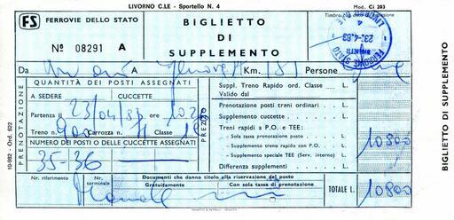 | Keywords: Ferrovie dello Stato train ticket extra charge 08291.jpg en ITA Ferrovie dello Stato Italiane hand writing supplementary Train ticket issued on April 25 1983 Own work from scan Piergiuliano Chesi 1983-04-25 trademarked Rail tickets of Italy |