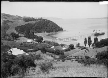 | Keywords: blackandwhite monochrome outdoor black and white View of Cowes Bay taken from a high vantage point above the bay and looking north. Pakatoa Island is just visible in the far distance on the right. A ferry is moored at the wharf. The Cowes Bay boarding house / hotel? is in the immediate foreground on the left. People can be seen crowded around the pavilion or passenger waiting room (?) in the middle distance near the end of the wharf. Taken by William Archer Price in early 1900s. Inscriptions: Inscribed - Photographer's title on negative -bottom right: Cowes Bay. Waiheke. Auckland. No 1852. Quantity: 1 b&w original negative(s). Physical Description: Dry plate glass negative 4.5 x 6.5 inches Ferry at the wharf, Cowes Bay, Waiheke Island. Price, William Archer, 1866-1948 :Collection of post card negatives. Ref: 1/2-000448-G. Alexander Turnbull Library, Wellington, New Zealand. natlib.govt.nz/records/22694285 View of Cowes Bay taken from a high vantage point above the bay and looking north. Pakatoa Island is just visible in the far distance on the right. A ferry is moored at the wharf. The Cowes Bay boarding house / hotel? is in the immediate foreground on the left. People can be seen crowded around the pavilion or passenger waiting room (?) in the middle distance near the end of the wharf. Taken by William Archer Price in early 1900s. Inscriptions: Inscribed - Photographer's title on negative -bottom right: Cowes Bay. Waiheke. Auckland. No 1852. Quantity: 1 b&w original negative(s). Physical Description: Dry plate glass negative 4.5 x 6.5 inches Ferry at the wharf, Cowes Bay, Waiheke Island. Price, William Archer, 1866-1948 :Collection of post card negatives. Ref: 1/2-000448-G. Alexander Turnbull Library, Wellington, New Zealand. natlib.govt.nz/records/22694285 |