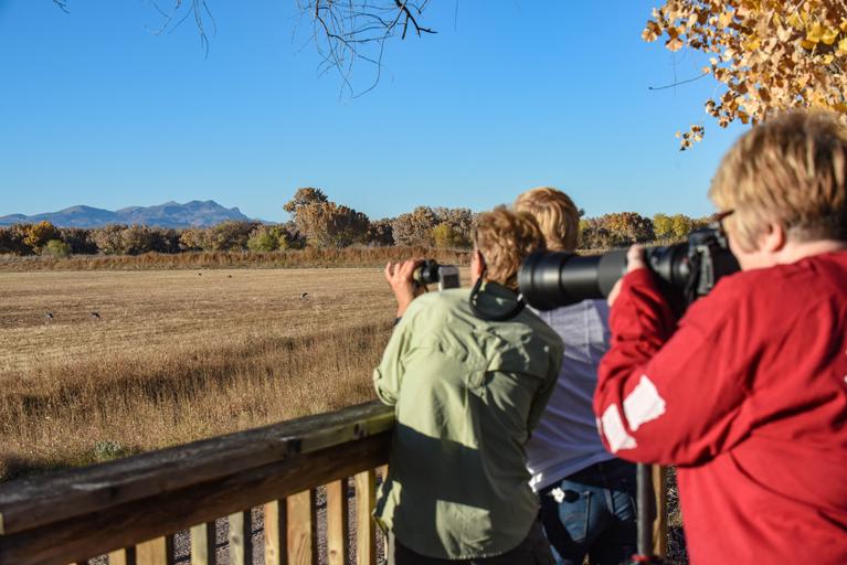 Keywords: Visitors observe and photograph Sandhill Cranes in the field from Willow Deck. Jessie Jobs/USFWS