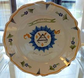| Keywords: Fidelitas assiette.jpg en The center shows a square the freemasonry symbol over 2 ears cereal plants The square Third Estate is surrounded by 3 fleurs de lys symbols of royalty To the left is a crosier of a bishop symbol of the clergy and to the right the pommel of an épée symbol of the nobility Fidelitas pax et concordia means fidelity peace and concord own Stanzilla Anonymous or 1790 1791 Faience of Nevers on the French Revolution 1790s works in France Masonic artifacts Files by User Stanzilla Plates of France Faience in the Musée des Beaux-Arts de Bernay Cc-zero |