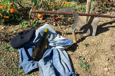 Keywords: field garden gardener gardening beret serpe bottle wine