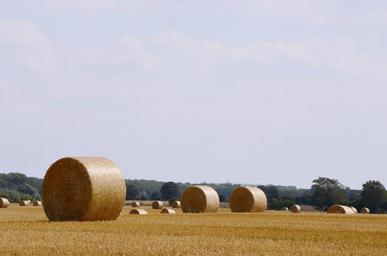 Keywords: field harvest agriculture summer cereals nature field crops harvested arable straw round bales straw bales sun fields meadow perspective