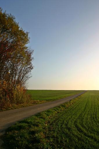 Keywords: field lane away nature tree bush autumn abendstimmung sun light landscape horizon sky arable agriculture road direction baden württemberg southern germany germany lighting autumn mood