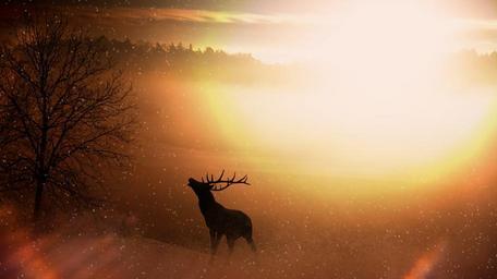 Keywords: field nature hirsch wild antler sunrise lighting fog snowflakes