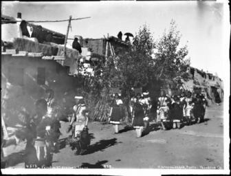 | Keywords: Fiesta de San Esteban (Saint Stephen), Acoma Pueblo, ca.1900 (CHS-4513).jpg en <br> Fiesta de San Esteban Saint Stephen Acoma Pueblo ca 1900 Photograph of the Fiesta de San Esteban Saint Stephen Acoma Pueblo ca 1900 The dozen or so Acoma Indians are wearing traditional garments including elaborate head pieces They carry goard instruments and feathers in their hands as they dance The building behind the dancers is made of adobe with exposed wood tail rafters Ladders lean against the long building at intervals A large tree grows at center Some people observe from the roof The dancers are dancing in a procession along the road next to the building Call number CHS-4513 Photographer James George Wharton Filename CHS-4513 Coverage date circa 1900 Part of collection California Historical Society Collection 1860-1960 Type images Geographic subject city or populated place Acoma Pueblo Repository name USC Libraries Special Collections Accession number 4513 Microfiche number 1-160-5 Archival file chs_Volume96/CHS-4513 tiff Part of subcollection Title Insurance and Trust and C C Pierce Photography Collection 1860-1960 Repository address Doheny Memorial Library Los Angeles CA 90089-0189 Geographic subject country USA Format aacr2 2 photographs transparency photoprint b w ; 17 x 22 cm 20 x 25 cm Rights Digitally reproduced by the USC Digital Library; From the California Historical Society Collection at the University of Southern California Subject adlf tribal areas Project USC Repository email specol usc edu Identifying number unidentified no James-858 Contributing entity California Historical Society Date created circa 1900 Publisher of the digital version University of Southern California Libraries Format aat transparencies; photographic prints; photographs Geographic subject state New Mexico Legacy record ID chs-m16849; USC-1-1-1-13461 Access conditions Send requests to address or e-mail given Phone 213 821-2366; fax 213 740-2343 Subject file heading Indians -- Acoma Subject lcsh Indians of North America; Acoma Indians Subject Acoma Indians; Acoma Indians; Acoma circa 1900 date created George Wharton James 1858 1923 http //digitallibrary usc edu/cdm/ref/collection/p15799coll65/id/16771 PD-old-70-1923 Images from USC Digital Library uploaded by Fæ Photographs by George Wharton James California Historical Society Collection 1860-1960 Acoma Pueblo |