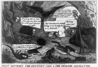| Keywords: Fight Between the Kentucky Coon and the Tennessee Alligator.jpg en A woodland fantasy satirizing the prominent figures of the 1844 election campaign The artist again favors Whig candidate Henry Clay the Kentucky Coon who is shown overwhelming Democrat James K Polk the Tennesse Alligator in a wrestling contest Clay exults It is no use to try to poke this nondescript animal i e Polk against the Peoples Coon Oddly the head on the alligator here bears little resemblance to the dark horse candidate About the forest lurk several other animals with the heads of Democrat and Whig notables On the right stands John C Calhoun as a camel and Andrew Jackson as a giraffe Calhoun carries on his back a cornucopia filled with turnips and declares We bring peace and plenty Jackson Altho I am one of those exalted characters who can overlook almost everything yet I cannot overlook this disaster to our cause Several rats scurry past the two Democrats one of them being Martin Van Buren who says I'm off for Lindenwald basely deserted by my friends Lindenwald was the name of Van Buren's estate whence he retired after losing the Democratic nomination to Polk To the left incumbent John Tyler as a rattlesnake coils around a tree Tyler who acceded to the presidency on William Henry Harrison's death was considered a traitor to the Whig cause On the ground nearby is a bear Daniel Webster who says referring to Polk I'll put my foot on him when you are done and that will sink him out of sight Running ahead of Webster is hard-money advocate Thomas Hart Benton as a boar with a sack of Mint Drops on his back He exclaims That Coon does not evidently belong to our family but he is a ROARER Perched on a branch above is an American eagle with his wings outspread a common patriotic emblem Library of Congress Prints and Photographs Division James Baillie 1844 PD-old 1844 cartoons Caricatures of Henry Clay Caricatures of James K Polk John Calhoun Caricatures of Andrew Jackson Caricatures of Martin Van Buren Caricatures of John Tyler Daniel Webster Thomas Hart Benton senator |