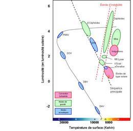 | Keywords: Figure6.diagHR.png 6 Diagramme de Hertzsprung Russel HR des étoiles pulsantes Le diagramme HR représente les étoiles en fonction de 2 observables leur température de surface et leur luminosité La position des différents types connus d étoiles oscillantes y est illustrée Les couleurs représentent les différents types d oscillations attendus En bleu et vert c'est une perturbation du profil de l'opacité influençant le transfert de l énergie qui déclenche un mécanisme de piston mécanisme kappa excitant respectivement des modes acoustiques de gravité En rouge ce sont les mouvements turbulents de convection à la surface comme pour le Soleil Dans la bande d instabilité régions où les oscillations sont entretenues par le mécanisme kappa se situent les Céphéides et les RR Lyrae La ligne en tiret représente la séquence principale SP la phase durant laquelle les étoiles consomment l'hydrogène de leur noyau le transformant en hélium Les étoiles y sont dans un état stable et leur structure change à cause de la lente modification de leur composition chimique Les étoiles passent ainsi la plus grande partie de leur vie sur la séquence principale En dehors de celle-ci les étoiles sont au début ou à la fin de leur vie Sur et près de la SP du plus froid au plus chaud on trouve les pulsateurs de type solaire Doradus Scuti SPB et Céphéides La région des Mira correspond à la branche des géantes rouges La ligne pointillée représente l évolution des naines blanches lors de leur refroidissement classés en fonction de leur type spectral O B A D après Christensen-Dalsgaard 2006-12-31 own assumed Pascal57 Hertzsprung-Russell diagram |