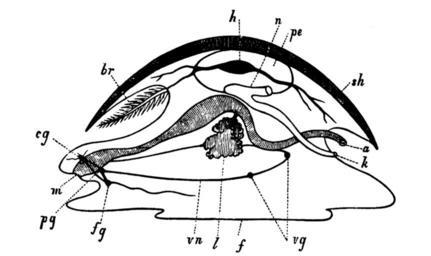 | Keywords: Figure 551 - Diagram of a Mollusc (altered from Lankester).jpg en A diagram of a hypothetical ancestral mollusc by Nicholson and Lydekker altered from an earlier diagram by Lankester M mouth; A anus; L liver; F foot; SH shell attached to the mantle; H heart; PE pericardium; N kidney nephridium opening internally into the pericardium and externally near the anus K BR gill branchia ; CG cerebral ganglion; PG pleural ganglion; FG pedal ganglion; VG visceral ganglion; VN visceral nerve cord 1889 A Manual of Paleontology Vol I P 671 published 1889 Henry Nicholson and Richard Lydekker other versions PD-old-70-1923 Uploaded with UploadWizard Mollusca anatomy Language-neutral diagrams |