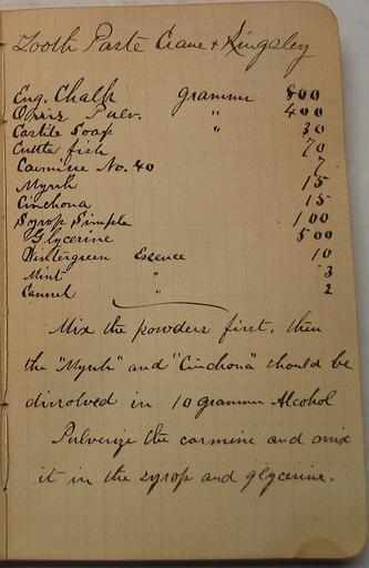 Keywords: Figure-7-2-LT-Sheffield-Notebook.png en L T Sheffield ™s 1878 notebook with toothpaste formula page 2 2014-01-10 11 01 14 Sheffield Pharmaceuticals' Private Archives Sheffield Pharmaceuticals Custom license marker 2014 01 10 Sheffield Pharmaceuticals Owns the Items in their Private Archives Uploaded with UploadWizard History of dentistry Toothpaste New London Connecticut Notebooks |