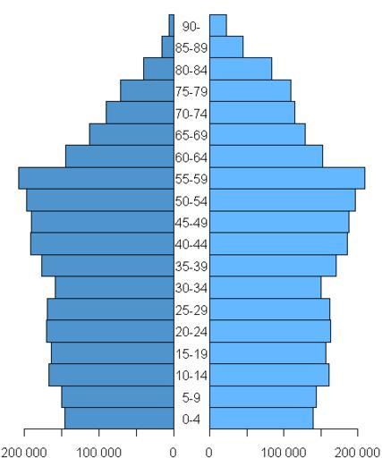 | Keywords: Fin population by age 2005.png  Finnish population by age and gender end of 2005 Men left dark blue / Women right light blue Suomen väestö iän ja sukupuolen mukaan vuoden 2005 lopussa Miehet vasen tumman sininen / Naiset oikea vaalean sininen Data from http //www tilastokeskus fi/tup/suoluk/suoluk_vaesto_en html Statistics Finland Population by age group end of 2005 graph own work 2007-03-05 Jkv PD-Own R source R source www r-project org m <- c 145596 149894 167327 164118 170710 169408 158395 176975 191803 191198 196815 207826 145517 113204 90986 70909 40013 15887 5769 w <- c 139353 143522 161212 156824 163226 161766 150595 170779 185979 187897 196158 209062 152460 129230 114778 109611 83845 44605 22328 a <- c 0-4 5-9 10-14 15-19 20-24 25-29 30-34 35-39 40-44 45-49 50-54 55-59 60-64 65-69 70-74 75-79 80-84 85-89 90- png fin_population_by_age png width 480 height 480 1 2 par mfcol c 1 2 mar c 2 1 2 1 1 2 y <- barplot -m space 0 horiz T xlim c -210000 0 axes F yaxs i col steelblue3 axis 1 at -4 0 50000 labels c 200 000 100 000 0 barplot w space 0 horiz T axes F yaxs i col steelblue1 axis 1 at 0 4 50000 labels c 0 100 000 200 000 axis 2 at y labels a tick F las 1 line 1 hadj 5 dev off Population pyramids of Finland |
