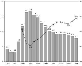 | Keywords: Fin unemployment.svg Finnish unemployment rate left axis bars and employment rate right axis line between 1988 and 2006 Suomen työttömyysaste vasen asteikko pylväät ja työllisyysaste oikea viiva vuosina 1988 - 2006 Eurostat Labour Force Survey graph own work 2007-06-18 Jkv PD-Own R source Eurostat 18 6 2007 Employment rate 15 to 64 years Finland 1992 - 2006 e <- c 65 1 61 0 60 3 61 6 62 4 63 3 64 6 66 4 67 2 68 1 68 1 67 7 67 6 68 4 69 3 Harmonized unemployment rates Finland 1988 - 2006 u <- c 4 2 3 1 3 2 6 6 11 7 16 3 16 6 15 4 14 6 12 7 11 4 10 2 9 8 9 1 9 1 9 0 8 8 8 4 7 7 library RSvgDevice devSVG fin_unemployment svg width 15 height 12 par mar c 3 5 3 5 1 2 5 las 1 mgp c 2 4 1 0 cex 2 x <- barplot u names arg 1988 2006 col gray65 space 3 ylim c 0 20 ylab xaxs r xlim c 8 24 2 text x u+ 4 format u T lines x5 19 e-55 lwd 2 points x5 19 e-55 lwd 2 cex 1 5 pch 1 axis 4 seq 0 20 5 seq 55 75 5 text c x5 x7 x17 x19 c e-55 c 1 3 13 15 +c 5 - 7 - 7 5 format c e c 1 5 13 15 T di 3 box dev off Created with R Economy of Finland Unemployment in Finland Eurostat |