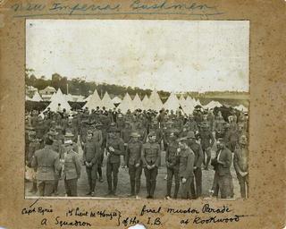| Keywords: ryrie imperial bushmen imperialbushmen boer war boerwar mckenzie soldiers vintage 1899 rookwood australia a squadron asquadron text drawing NSW Imperial Bushmen at their final muster before embarkation to South Africa to fight in the Boer War. The commander of 'A' Squadron Capt. G Ryrie is standing right at the bottom left of the photo with his back to the camera. 1st Lt McKenzie is standing next to him. The horses and tents can be seen in the background. This is the Rookwood Army Camp west of Sydney. The area is now known as Lidcombe in Western Sydney. (found on ebay) NSW Imperial Bushmen at their final muster before embarkation to South Africa to fight in the Boer War. The commander of 'A' Squadron Capt. G Ryrie is standing right at the bottom left of the photo with his back to the camera. 1st Lt McKenzie is standing next to him. The horses and tents can be seen in the background. This is the Rookwood Army Camp west of Sydney. The area is now known as Lidcombe in Western Sydney. (found on ebay) |