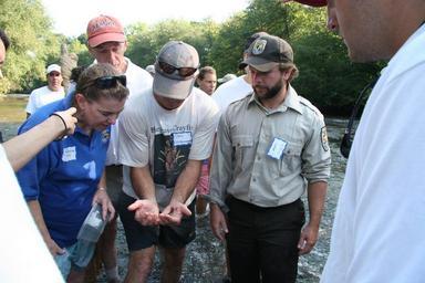 | Keywords: identification employee biologist None of the endangered or threatened fish were found on the trip, but other small fish, including the Coosa madtom, banded sculpin and bronze darter were found. U.S. Fish and Wildlife Service biologist Robin Goodloe, and trip leader Eric Prowell, flank Chris Crow with CCR Environmental Inc. None of the endangered or threatened fish were found on the trip, but other small fish, including the Coosa madtom, banded sculpin and bronze darter were found. U.S. Fish and Wildlife Service biologist Robin Goodloe, and trip leader Eric Prowell, flank Chris Crow with CCR Environmental Inc. |