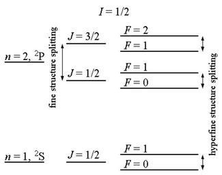 | Keywords: Fine hyperfine levels.png Fine and hyperfine structure in hydrogen The coupling of the different angular momenta leads to energy level splitting Not drawn to scale The electron spin angular momentum S is coupled to the electron orbital angular momentum L to form the total electronic angular momentum J This is subsequently coupled to the nuclear spin angular momentum I to form the total angular momentum F The term symbol takes the form <sup>2S+1</sup>L with the values of L represented by letters S P D F G H 0 1 2 3 4 5 so that for instance a <sup>2</sup>P term represents a state with S 1/2 and L 1 The single electron in a 1s subshell gives rise to the <sup>2</sup>S term L 0 and S 1/2 can only combine to give J 1/2 This in turn can combine with the nuclear spin I 1/2 to give total angular momentum F 0 1 The single electron in a 2p subshell gives rise to the <sup>2</sup>P term L 1 and S 1/2 can combine to give J 1/2 and J 3/2 These can combine with the nuclear spin I 1/2 to give total angular momenta F 0 1 and F 1 2 respectively The hyperfine splitting of the ground <sup>2</sup>S state is the source of the 21 cm hydrogen line important in astronomy own DJIndica 2008-09-09 File Hydrogen-Fine-Hyperfine-Levels svg chemistry Check categories 2008 November 14 en wikipedia Hyperfine_structure en wikipedia Hydrogen_line Hydrogen Radio astronomy History of physics Cosmology Spectroscopy Hydrogen physics |