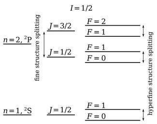 | Keywords: Fine hyperfine levels.svg Fine and hyperfine structure in hydrogen The coupling of the different angular momenta leads to energy level splitting Not drawn to scale The electron spin angular momentum S is coupled to the electron orbital angular momentum L to form the total electronic angular momentum J This is subsequently coupled to the nuclear spin angular momentum I to form the total angular momentum F The term symbol takes the form <sup>2S+1</sup>L with the values of L represented by letters S P D F G H 0 1 2 3 4 5 so that for instance a <sup>2</sup>P term represents a state with S 1/2 and L 1 The single electron in a 1s subshell gives rise to the <sup>2</sup>S term L 0 and S 1/2 can only combine to give J 1/2 This in turn can combine with the nuclear spin I 1/2 to give total angular momentum F 0 1 The single electron in a 2p subshell gives rise to the <sup>2</sup>P term L 1 and S 1/2 can combine to give J 1/2 and J 3/2 These can combine with the nuclear spin I 1/2 to give total angular momenta F 0 1 and F 1 2 respectively The hyperfine splitting of the ground <sup>2</sup>S state is the source of the 21 cm hydrogen line important in astronomy File Fine_hyperfine_levels png originally created by User DJIndica Converted to SVG by w User Edudobay w User Edudobay 2010-05-16 Radio astronomy History of physics Cosmology Spectroscopy Hydrogen physics |