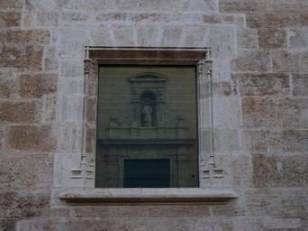 Keywords: Finestra del Palau de Benicarló, València.JPG ca Finestra del Palau de Benicarló actual seu de les Corts Valencianes Es reflecteix la portada de l'església de Sant Llorenç València own Joanbanjo 2010-05 Palau de Benicarló