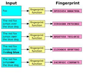 | Keywords: Fingerprint.svg en Shows a typical fingerprint function at work The fingerprints seen here in hexadecimal format are actually the first eight bytes 64 bits of the SHA-1 cryptographic hash functions of those text examples own 2008-11-22 Original by User Helix84 adapted by Jorge Stolfi Communication models Surveillance |