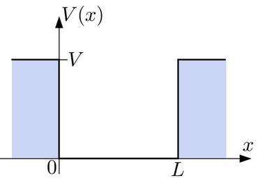 Keywords: Finite Square Potential Well.svg A diagram of a square finite potential well between 0 and L The potential outside the well is V and the potnetial inside is 0 Own Inkscape 2007-05-27 Inductiveload 1D finite square wells