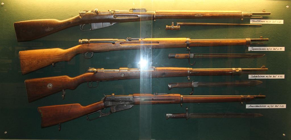 | Keywords: Finnish civil war rifles.JPG en Various rifles used in the Finnish civil war with bayonets in Mikkeli Infantry museum From the top Russian 7 62 mm Mosin-Nagant m/91 Japanese 6 5 mm Type 38 Arisaka m/1905 German 7 92 mm Mauser m/1898 American 7 62 mm Winchester m/1895 fi Suomen sisällisodassa käytettyjä kivääreitä pistimineen Jalkaväkimuseossa Ylhäältä Venäläinen 7 62 mm Mosin-Nagant m/91 Japanilainen 6 5 mm Type 38 Arisaka m/1905 Saksalainen 7 92 mm Mauser m/1898 Amerikkalainen 7 62 mm Winchester m/1895 own MKFI 2011-07-13 61 40 57 32 N 27 15 44 2 E region FI Mosin-Nagant rifle Type 38 rifle Mauser M1898 Winchester rifles Rifles of Finland Mikkeli Infantry museum Taken with Canon EOS 60D Taken with Canon EF-S 15-85mm F3 5-5 6 IS USM Bayonets ImageNote 1 164 73 4484 488 4671 2252 2 en Russian 7 62 mm Mosin-Nagant m/91 fi Venäläinen 7 62 mm Mosin-Nagant m/91 ImageNoteEnd 1 ImageNote 2 164 565 4484 479 4671 2252 2 en Japanese 6 5 mm Type 38 Arisaka m/1905 fi Japanilainen 6 5 mm Type 38 Arisaka m/1905 ImageNoteEnd 2 ImageNote 3 169 1049 4484 433 4671 2252 2 en German 7 92 mm Mauser m/1898 fi Saksalainen 7 92 mm Mauser m/1898 ImageNoteEnd 3 ImageNote 4 173 1486 4484 679 4671 2252 2 en American 7 62 mm Winchester m/1895 fi Amerikkalainen 7 62 mm Winchester m/1895 ImageNoteEnd 4 Files by User MKFI |