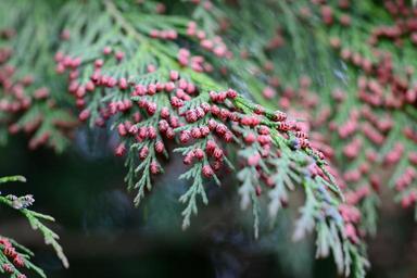 Keywords: fir balsam fir tree flowers spring close-up tiny red flowers green tree evergreen march macro