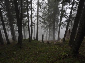 Keywords: fir forest firs fog forest trees tree trunks foggy haunting mystical creux du van swiss jura noiraigue