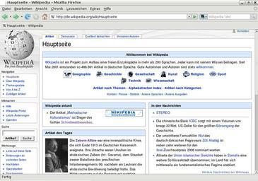 | Keywords: Firefox 2 de.png Mozilla Firefox 2 0 runnig under Debian GNU/linux 3 1 GNOME displaying the German Wikipedia Main Page/ Mozilla Firefox 2 0 unter Debian GNU/Linux GNOME mit der Hauptseite der deutschsprachigen Wikipedia Own October 28th 2006/ 28 Oktober 2006 n Chr MF-Warburg<small> de </small> free screenshot <br/>Software GPL LGPL MPL Wikipedia logo Cc-by-sa-3 0 Wikimedia trademark Text of Wikipedia and the P-xyz-lightblue png images in Willkommen bei Wikipedia GFDL relicense The image of emperor Wilhelm II PD-USGov Screenshots of Mozilla Firefox 2 x with German Debian screenshots German Wikipedia screenshots |