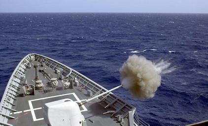 | Keywords: CG-48 firing.jpg USS Yorktown CG 48 fires its 5 inch gun at a target drone during a gun exercise USS Yorktown is currently in the Caribbean Sea for the 43rd annual UNITAS exercise UNITAS is the largest multi-national naval exercise conducted with Naval Forces from the United States Caribbean Sea South and Central America 020305-N-4616B-501 Navy http //www navy mil/view_image asp id 982 2002-03-05 Photographer ™s Mate Airman Rusty Black PD-USGov-Military-Navy 5 /54 caliber Mark 45 gun firing Aboard USS Yorktown CG 48 UNITAS 43-02 March 2002 photographs March 2002 in the United States Photos taken with Nikon D1 |