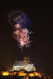 Keywords: fireworks church evening night new year radiant light explosion city celebration new year day petrov brno czech republic moravia blue red paste-up ignis brunensis the spectacle audience bat