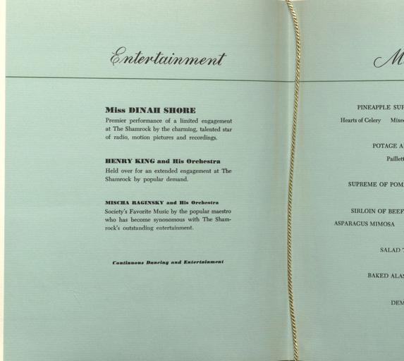 | Keywords: First Anniversary Saint Patrick's Day celebration - Entertainment and menu.jpg en Shamrock Hotel Houston Texas First Anniversary Saint Patrick's Day Celebration Entertainment - Dinah Shore 1950 The University of Houston Digital Library http //digital lib uh edu The University of Houston Digital Library Custom license marker 2012 04 29 This image is in the public domain and may be used freely If publishing in print electronically or on a website please use the citation Courtesy of Special Collections University of Houston Libraries To order a higher resolution reproduction see http //info lib uh edu/about/campus-libraries-collections/special-collections-archives/request-digital University of Houston Libraries Uploaded with UploadWizard 1950 documents Saint Patrick's Day in the United States Hotels in Houston Food menus 1950 in Houston |