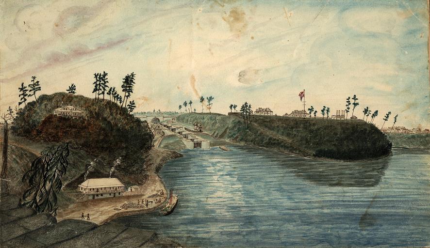 | Keywords: First Eight Locks of the Rideau Canal, the North entrance from the Ottawa River, 1834.jpg Artwork creator Thomas Burrowes First Eight Locks of the Rideau Canal the North entrance from the Ottawa River 1834 1834 watercolour Archives of Ontario Toronto Ontario Canada langswitch The painting shows the locks of the Rideau Canal the Barracks Hill promontory which would be become Parliament Hill containing three stone barracks and a hospital and John By's private residence on the opposite hill the site of the future Major's Hill Park A wharf and a building occupied by the Royal Engineers is located below the By residence on the bank of the Ottawa River The Commissariat is located to the right of the locks the building still stands and serves as the Bytown Museum On peut voir les écluses du canal Rideau la Colline des Casernes le promontoire qui allait devenir la Colline du Parlement - à l ™Ã©poque du tableau il y avait trois casernes en pierre et un hôpital au sommet de la colline la résidence privée du lieutenant-colonel John By au sommet de la colline oppose - située dans ce qui est aujourd ™hui le parc Major ™s Hill un quai et le bâtiment qui logeait les Royal Engineers plus bas au bord de la rivière des Outaouais et le Commissariat en remontant les écluses à droite - seul bâtiment représenté dans le tableau qui existe toujours C 1-0-0-0-13 Other versions Thomas Burrowes Ottawa River Parliament Hill 1834 paintings Major's Hill Park 1834 in Ottawa Bytown Museum Ottawa Locks PD-Canada PD-old-100 |