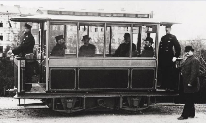 Keywords: First electric tram- Siemens 1881 in Lichterfelde.jpg Erste elektrische Straßenbahn von Siemens Halske die Bahn Lichterfelde “Kadettenanstalt The world ™s first electric tram the Groß-Lichterfelde Tramway began operation in 1881 in the Lichterfelde neighborhood of Berlin Germany and was produced by Werner von Siemens Direct current was supplied through the rails The tram car is 5m long by 2m wide and weighs 4 8 tonnes It travels at a maximum speed of 40 kilometres per hour and carries 20 people at a time In the first three months of operation the tram had already carried 12 000 passengers cite book The Siemens Tram from Past to Present http //www siemens pl/upload/images/TS-Siemens_lekkie 20pojazdy_historia pdf page 1 pdf English Siemens corporation 2009-01-07 1882 Author degraded but less cropped version of same image at thumb 2 File 1882 Strab jpg PD-old Trams in Berlin-Lichterfelde Siemens trams History of electrical engineering Werner von Siemens 1882 in tram transport in Germany Black and white photographs of trams Tram drivers History of Berlin-Lichterfelde Electrically-powered rail transport until 1900